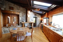 A heavily glazed corner room, having three windows and a fan-shaped vaulted ceiling with three rooflights providing excellent natural light levels. Exposed natural granite walls, with hardwood panelling to dado height. Ornamental fire surround, formed from substantial hardwood sections, with granite shelf. The room is fitted with an ample range of kitchen units, having hardwood panelled doors and drawer fronts crafted locally on Scilly, and hardwood worksurfaces with inset stainless steel double drainer sink unit. Slot in “New World” double oven cooker with ceramic hob and extractor over. Freestanding “Next” fridge/freezer. Circular dining table with seating for five people. Two triple-spotlight ceiling lights and four wall