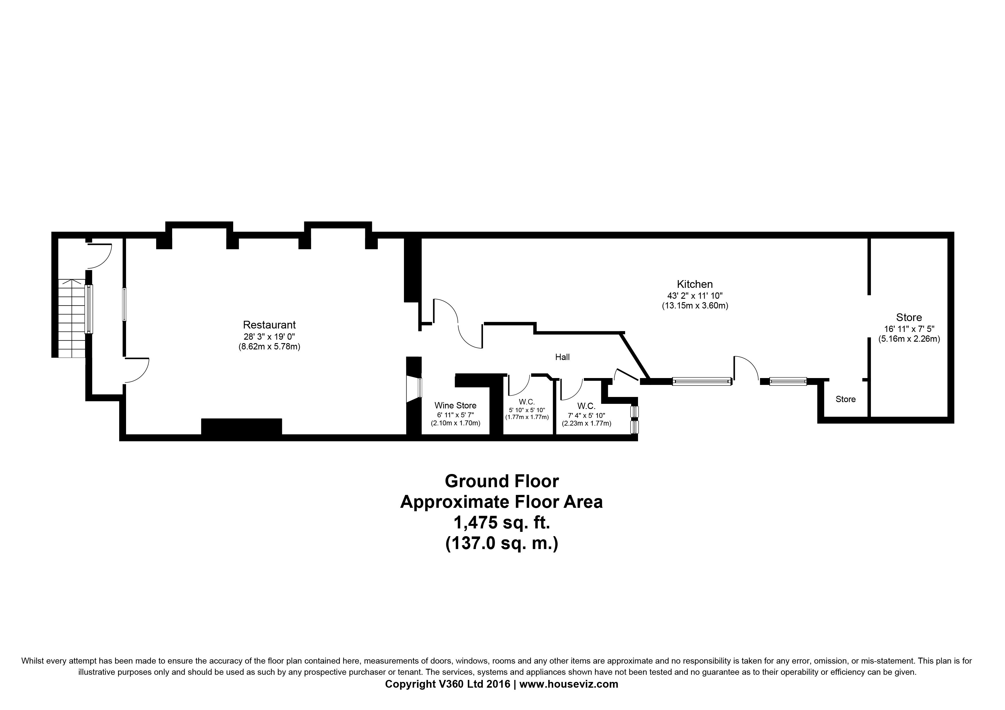 The rear of the restaurant opens onto a rear corridor, with access to the kitchen, wine cellar, wc’s and outside.