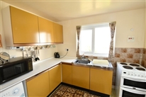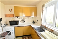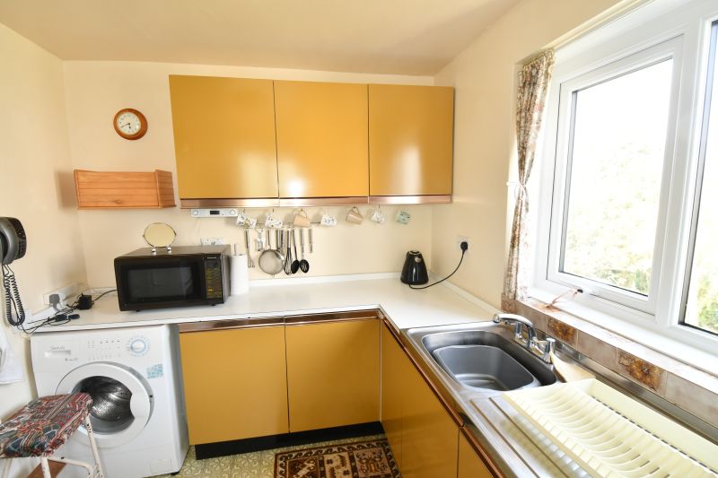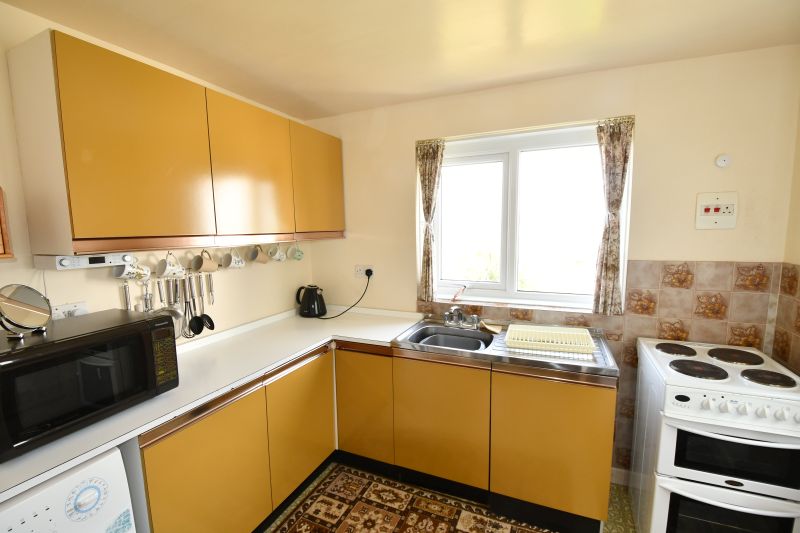 Situated at the rear of the flat and having views of St. Mary’s harbour and off islands. Patterned vinolay covered floor. Fitted on two sides with built in floor units having melamine working surfaces plus matching triple wall cabinets. Fittings include a single drainer stainless steel sink unit. Belling four ring hob and oven. Free standing Samsung fridge/freezer. Servis washing machine. Two UPVC double glazed windows. Seven power points. Electric cooker point. Fluorescent light. Telephone point.